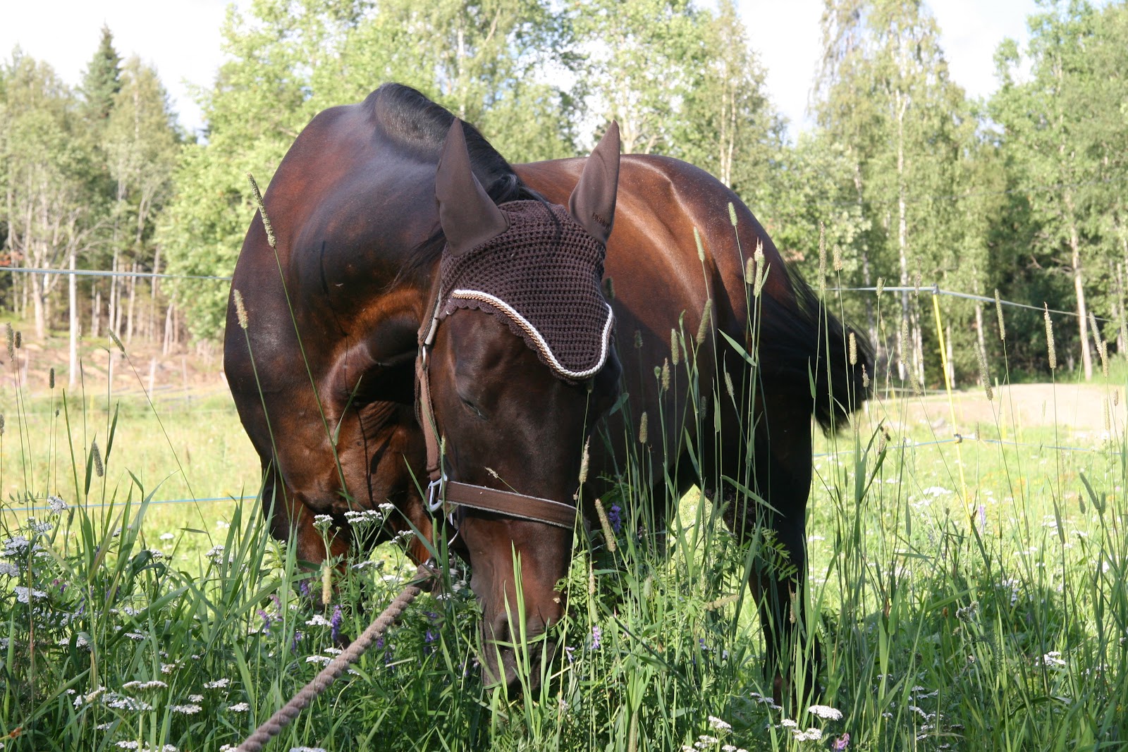 Takki päälle niin saa vähän suojaa öttiäisiltä. huom, nyt se seisoo jo irti loimen laitossa ;), eikä karannut heti syömään.. |
